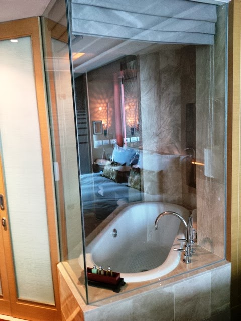 The bath room has a glass door with a curtain that can be open to have the look through feature. Personally I do not really like how they do it. Other hotel has some button that you can just press rather than mechanically that you have to roll it. But other than that, the bath room is quite spacious with seperate shower area and bath tube and water closet area.